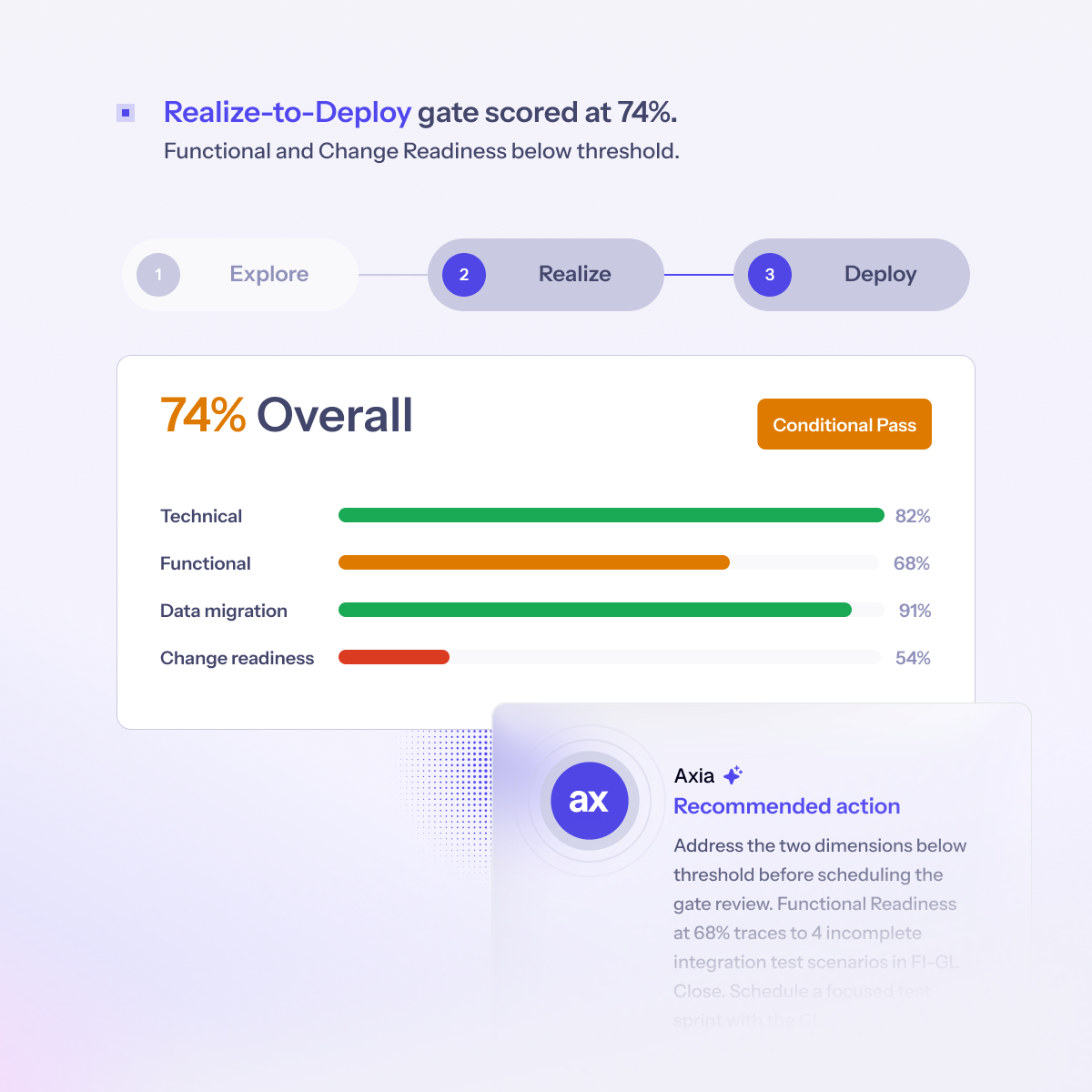 Monitor change readiness, role-level adoption signals, and downstream testing stability in one composite view, so phase transition decisions are based on evidence, not optimism.