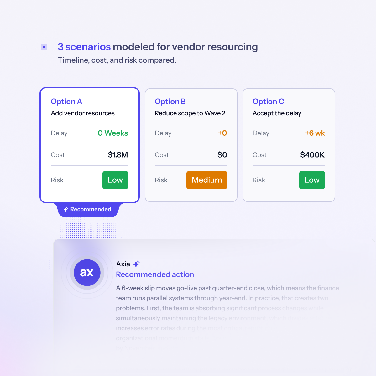 Model the full downstream impact of any decisions before committing. Timeline, budget, and risk compared side by side.
