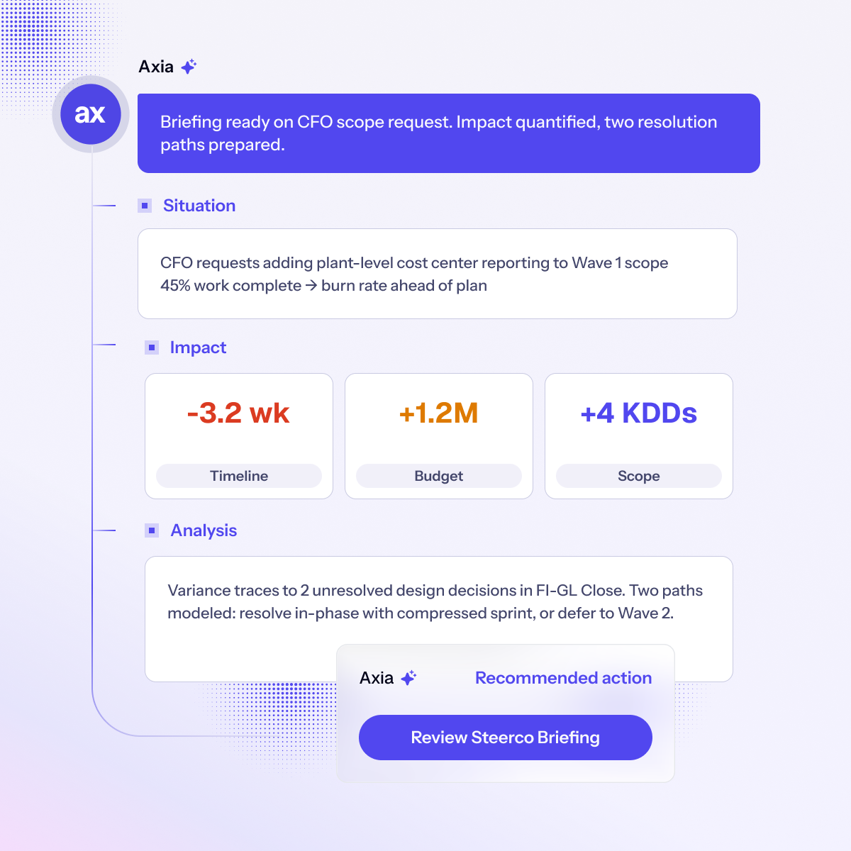 Axiamatic restores full execution context. By continuously mapping artifacts, decisions, and cross-stream dependencies, it exposes how changes connect and where exposure is forming, so executives act on structural reality, not summarized fragments.