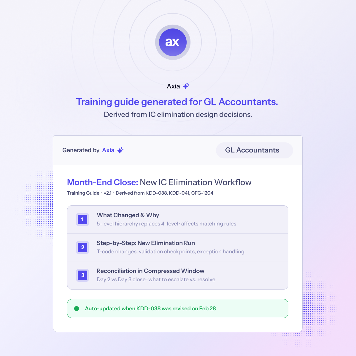 Generate training guides, job aids, and change collateral directly from key design decisions. Always role-specific. Always current.
