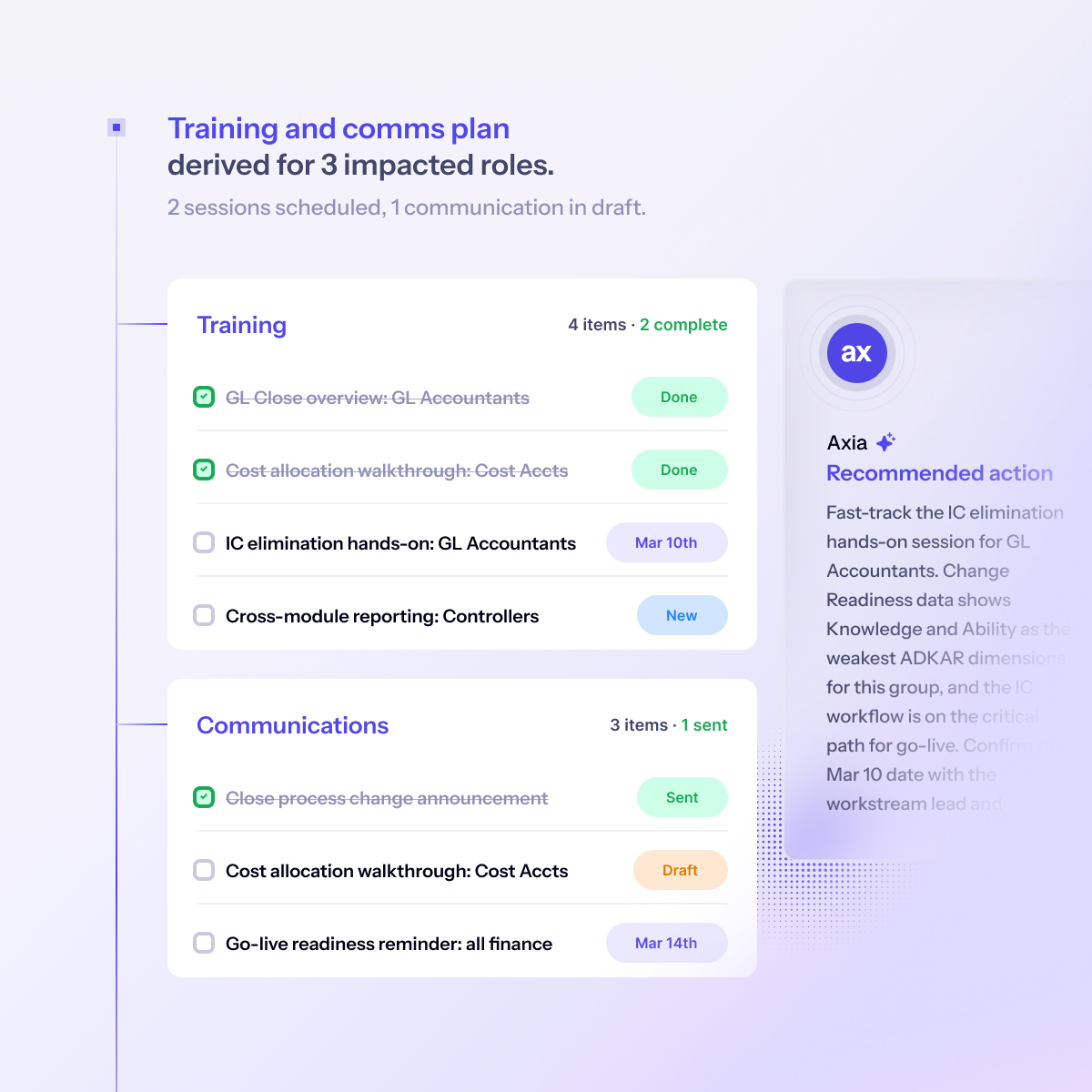 Adapt training and communication plans as the program evolves. Schedules, audiences, and content all derived from live readiness data.