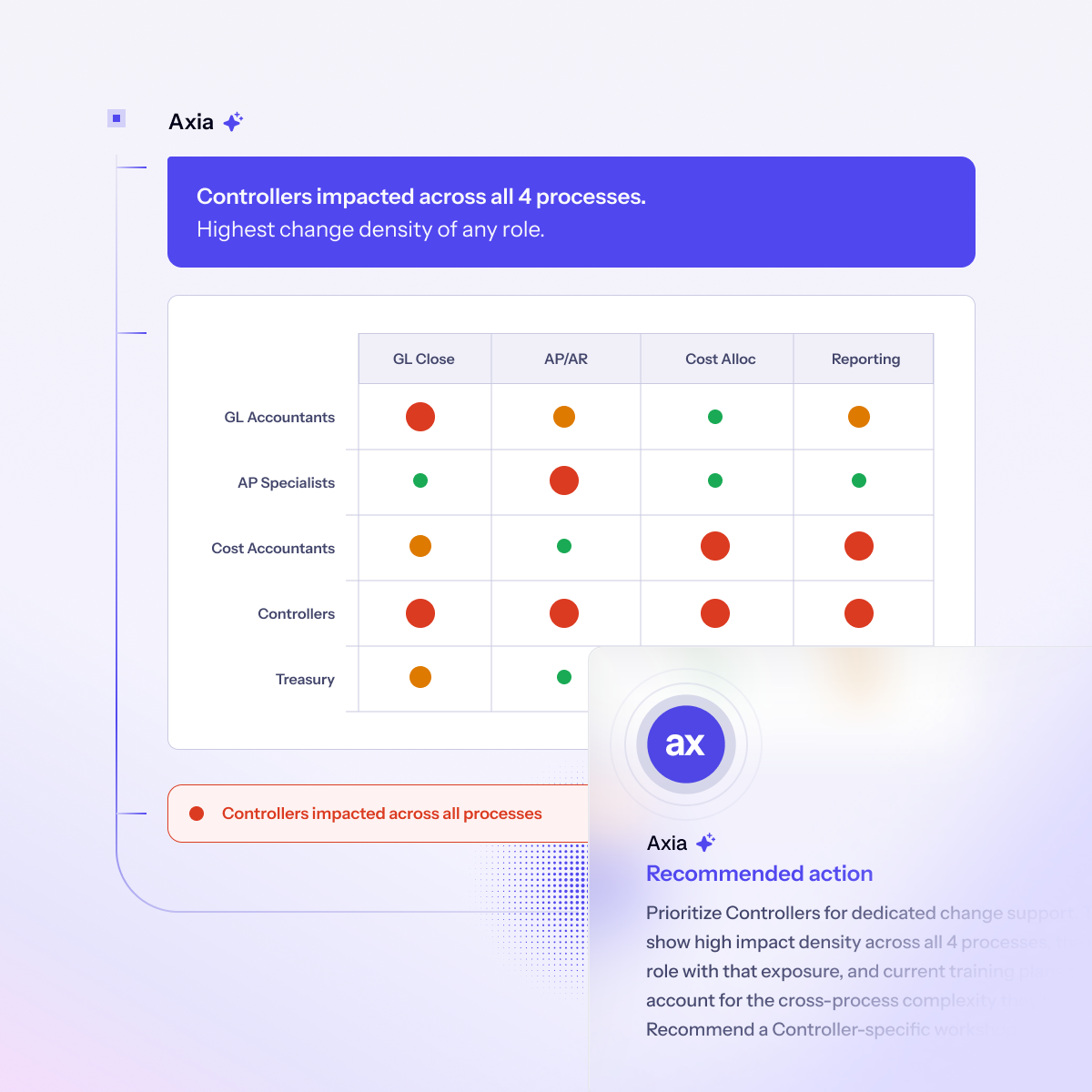 Axiamatic gives change leaders continuous insights into readiness, sentiment, and role-level impact, so confusion, overload, and hesitation are addressed before they turn into rollout risk.